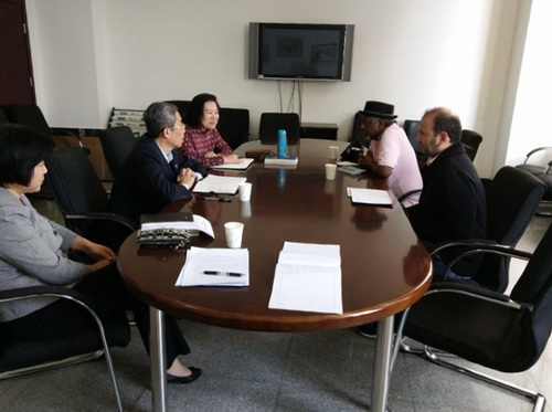 9月28日下午,合作学院党委书记罗庆丰、院长孙钰、副院长王妙、英语教学秘书杨晓莉在FIU大楼A区309会议室会见了负责英语口语教学的两位外籍教师Louis Davis和Besilk  Kapanadze,并进行了谈话。
